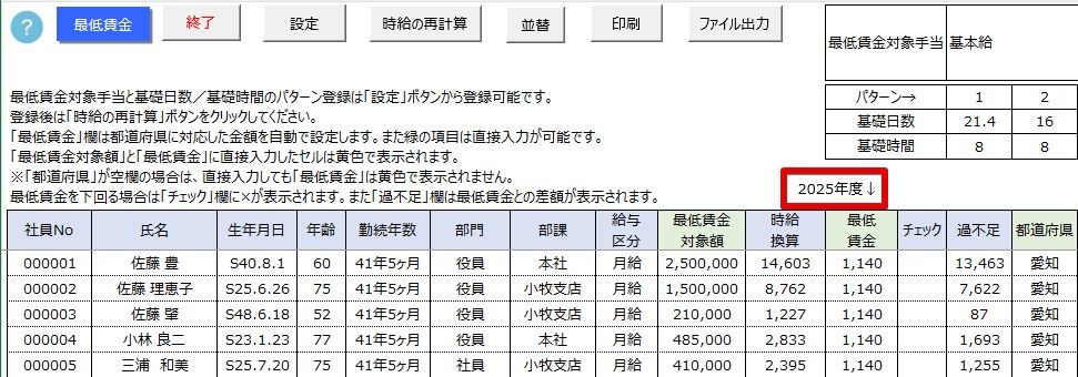 修正プログラムをダウンロード後、「個人情報」>「最低賃金」より開くと年度が2025年へ切り替わっています。