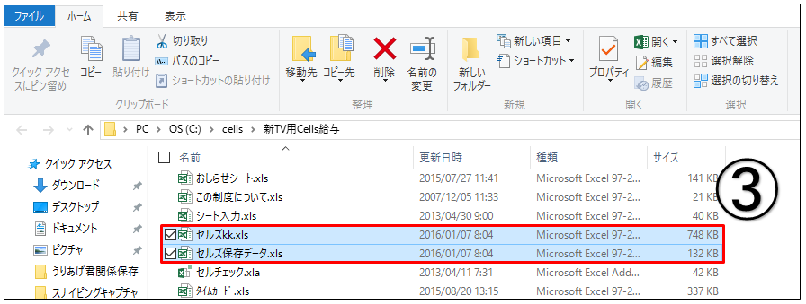 (たとえば事業所名がセルズという名前であった場合、セルズkk.xls セルズ保存データ.xlsという名称になります)