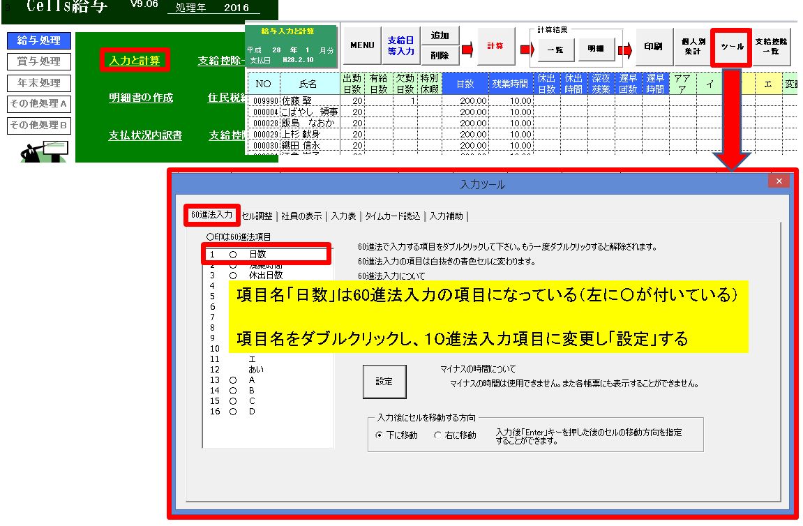 支給控除一覧表の勤怠項目が日数なのに「:(コロン)」で表示される Q.お問い合わせ 「支給控除一覧表」の勤怠項目が日数なのに、「:(コロン)」表示になってしまうので「.」表示にしたいのですが。 A.回答 「入力と計算」の「ツール」の「60進法入力」タブで「10進法」入力項目に変更してください。 その後「計算」を実行し、「支給控除一覧表」をご確認ください。 関連記事 勤怠項目を60進法で入力し、計算することはできますか? 操作マニュアル 支給控除一覧表をExcelファイルで出力する方法 勤怠を入力すると違う数字に変換される 支給控除一覧表の項目表示や文字の大きさの設定方法 お問い合わせをご希望のお客様へ 操作方法に関するお問い合わせ、製品エラーに関するお問い合わせなど、お客様の疑問にお答えする各種サポート・サービスについてご案内します。 お問い合わせフォームへ
