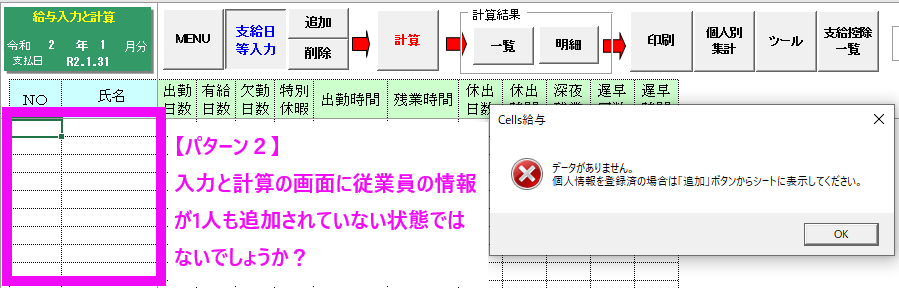 給与処理・賞与処理の入力と計算で「支給日等入力」をクリックすると、「データがありません。個人情報を登録済の場合は『追加』ボタンからシートに表示してください。」という警告メッセージが出て、先へ進めません。