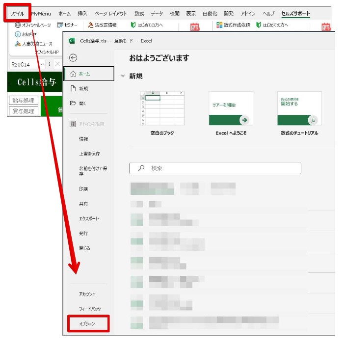 1.Excelを開き、「ファイル」⇒「オプション」をクリックします。