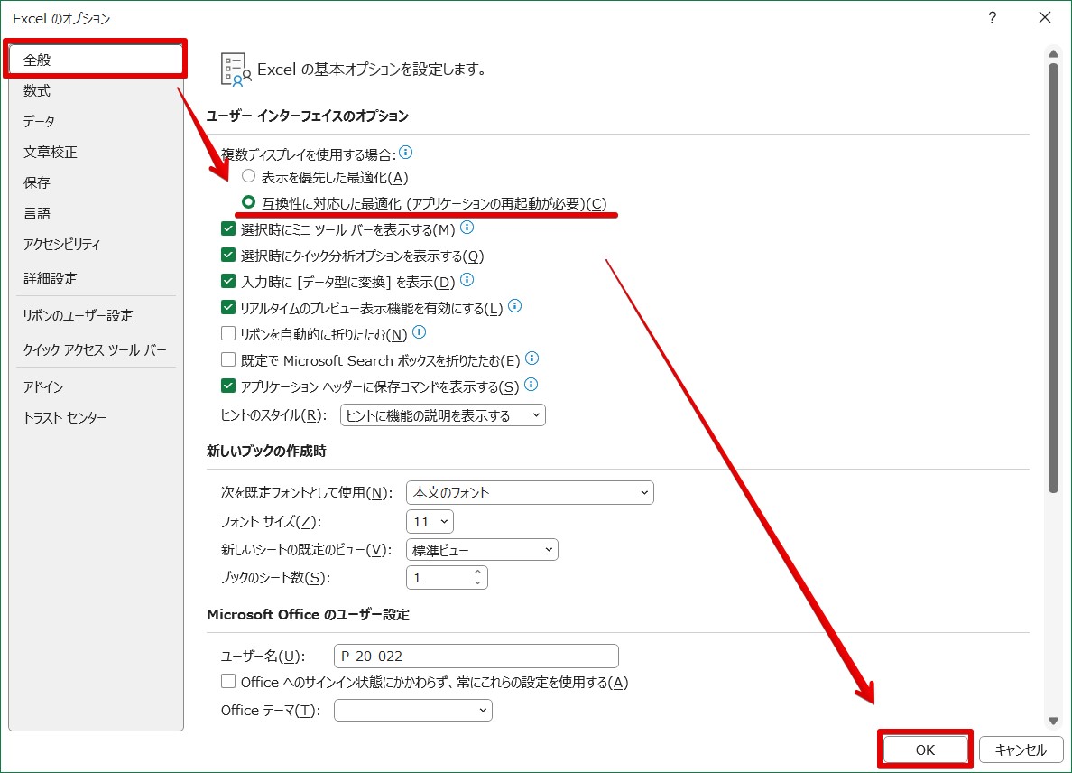 2.「全般」⇒「ユーザーインターフェイスのオプション」⇒複数のディスプレイを使用する場合を確認し、「互換性に対応した最適化」にラジオボタン(●)を入れて「OK」をクリックします。