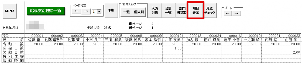 - 支給控除一覧表の「項目表示」をクリックします。