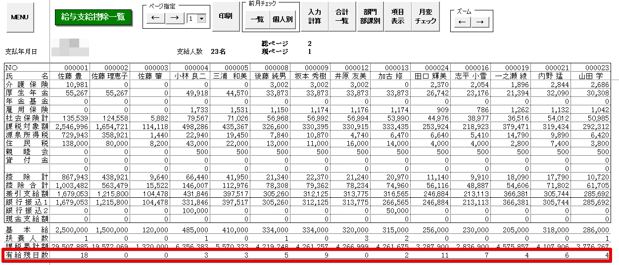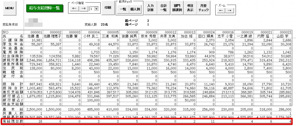 - 支給控除一覧表に有給残日数が表示されるようになります。