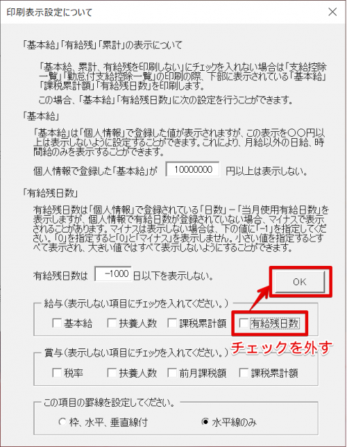 - 給与欄にある「有給残日数」のチェックを外し、「OK」をクリックします。