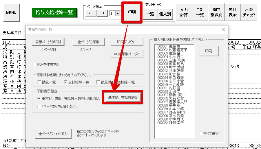 - 支給控除一覧表の「印刷」をクリックし、支給控除の印刷フォームにある 「基本給、有給残設定」をクリックします。