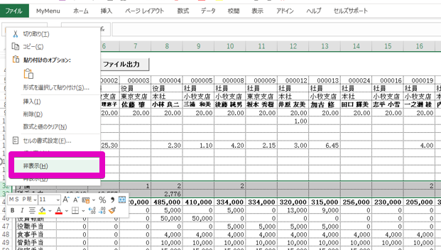 支給控除チェックで「予備」や「税手入力」を非表示にする方法 Q.お問い合わせ 給与計算後、支給控除チェックを開くと「予備」や「税手入力」が表示されます。支給控除チェックでは非表示にしたいのですが、どのようにすればよいでしょうか。 A.回答 「入力と計算」画面で「予備」や「税手入力」欄に数値が入力されている場合、支給控除チェックでは項目として表示される仕組みです。 非表示にするには、Excelシート上で手動により行を非表示に設定するようお願いいたします。 該当の行番号を右クリックし、「非表示」を選択することで項目行が非表示になります。 関連記事 入力した覚えのない数字が支給控除一覧表や賃金台帳に表示される 操作マニュアル 支給控除一覧表の項目表示や文字の大きさの設定方法 「税扶養人数」の対象となる要件 手当・控除項目の登録方法 お問い合わせをご希望のお客様へ 操作方法に関するお問い合わせ、製品エラーに関するお問い合わせなど、お客様の疑問にお答えする各種サポート・サービスについてご案内します。 お問い合わせフォームへ