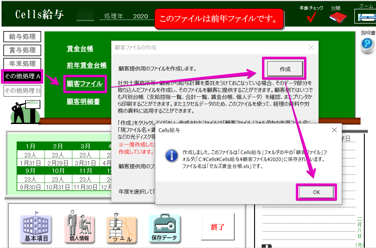 - 前年ファイルが開きます。 「その他処理A」のメニュー画面から「顧客ファイル」をクリックします。 「顧客提供用のファイルを作成します。」にて「作成」をクリックします。続いて表示される 「作成しました。~」のメッセージは、「OK」をクリックします。 ※この時、顧客ファイルの保存先を確認しておいてください。