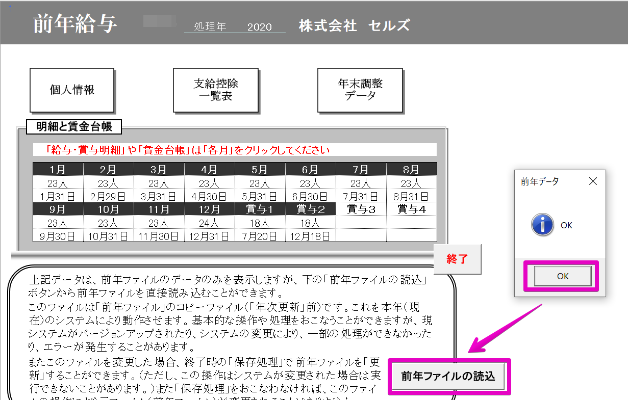 - しばらくすると「OK」と出るので、続けて「前年ファイルの読込」をクリックします。
