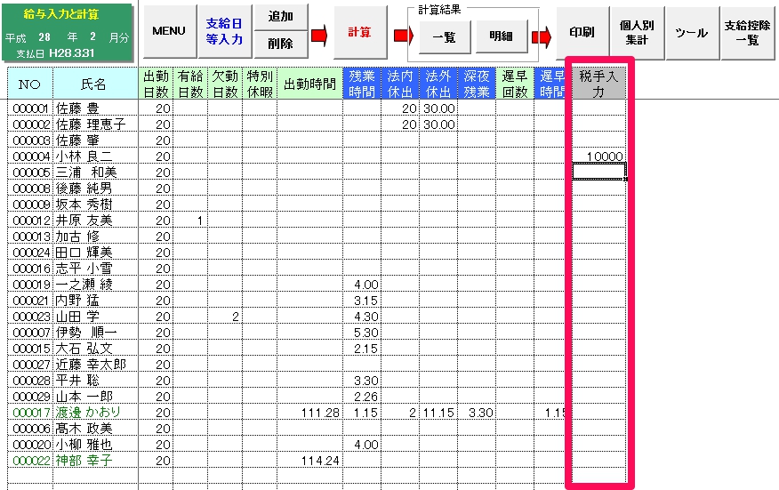 - 「税手入力」欄が表示されるので、控除したい額を直接入力すれば、計算時にその額が控除されます。