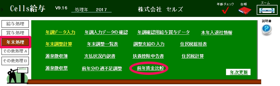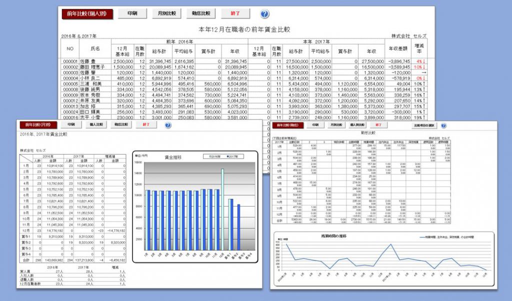 前年給与との比較資料を作成することはできますか? Q.お問い合わせ内容 Cells給与で比較資料が作成できると聞きましたが、どこから作成できますか? A.回答 前年(1~12月の一年分)からCells給与で給与計算をおこなっている場合、月ごとに前年と給与を比較した「前年比較資料」が作成できます。 この操作は、本年の12月まで給与が更新されている状態で作成します。 年末処理グループより前年賃金比較を開きます。 前年比の月別賃金と、勤怠の前年比較・推移資料、個人別の年収増減資料が作成できます。 関連記事 操作マニュアル 扶養内で働くために所得金額や出勤可能日数を確認する方法 令和7年分 年末調整の主な改正点と従業員への案内資料 手当・控除項目の登録方法 【リリース】通勤非課税調整機能・源泉徴収票の再交付に対応 お問い合わせをご希望のお客様へ 操作方法に関するお問い合わせ、製品エラーに関するお問い合わせなど、お客様の疑問にお答えする各種サポート・サービスについてご案内します。 お問い合わせフォームへ