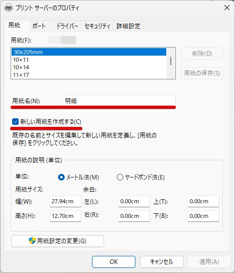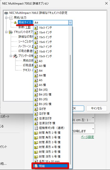 BP1204の明細用紙へ印刷をする際、プリンターの用紙設定で既定サイズが見つからない場合はプリンター側で用紙の設定が必要です。