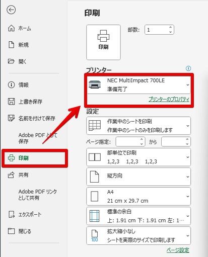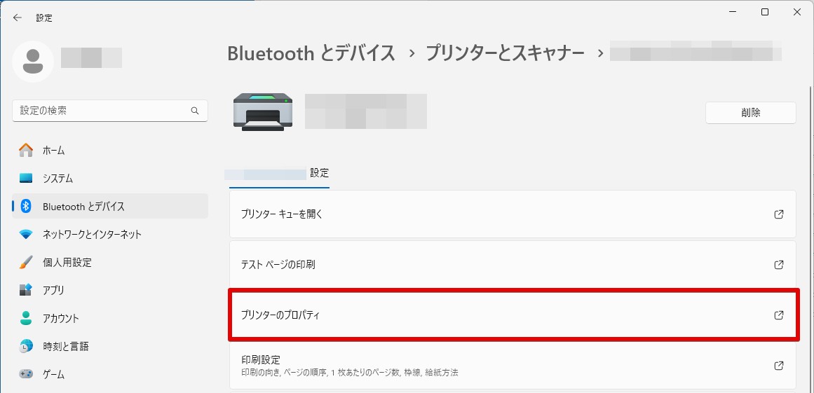 3.「印刷」>プリンターを選択し「プリンターのプロパティ」をクリック