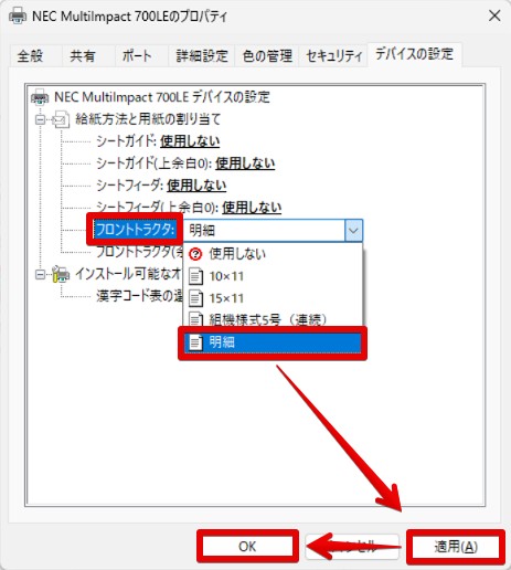 5.「デバイスの設定」タブで給紙方法と用紙サイズを選択し「適用」>「OK」をクリック