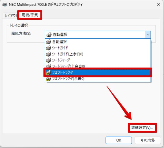 4.「用紙/品質」タブで給紙方法を選択し「詳細設定」をクリック