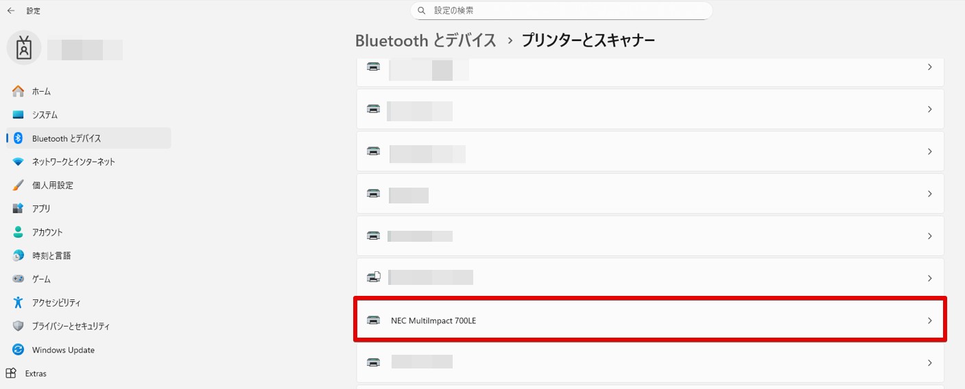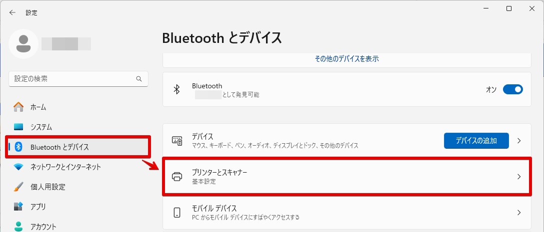 2.「Bluetoothとデバイス」→「プリンターとスキャナー」をクリック