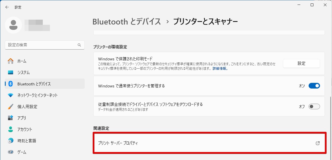 3.関連設定欄の「プリントサーバープロパティ」をクリック