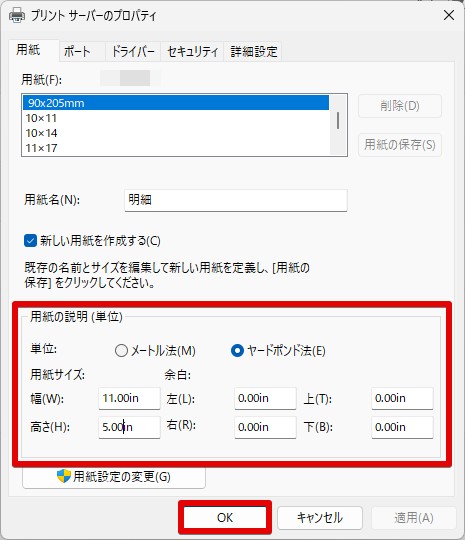 - 用紙サイズ:幅11.00in、高さ5.00in