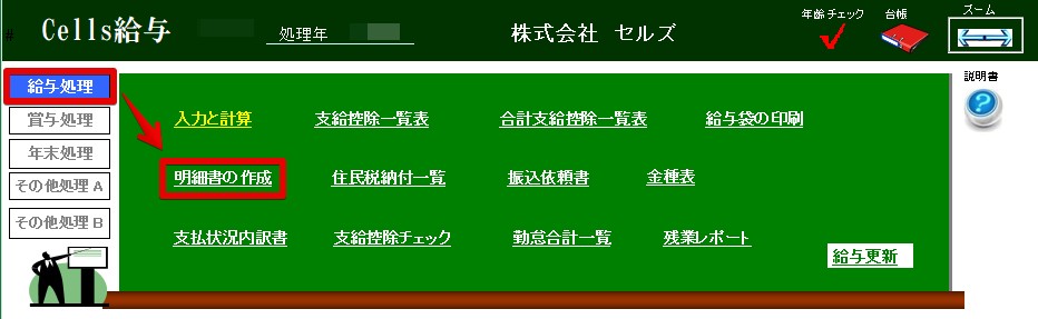 1.「給与処理」>「明細書の作成」をクリック