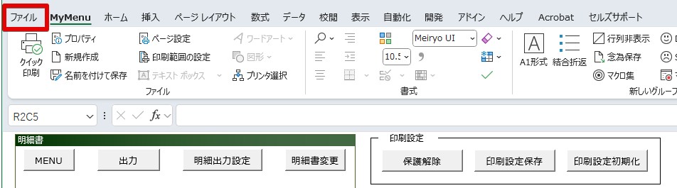 2.Excelリボンメニューの「ファイル」をクリック