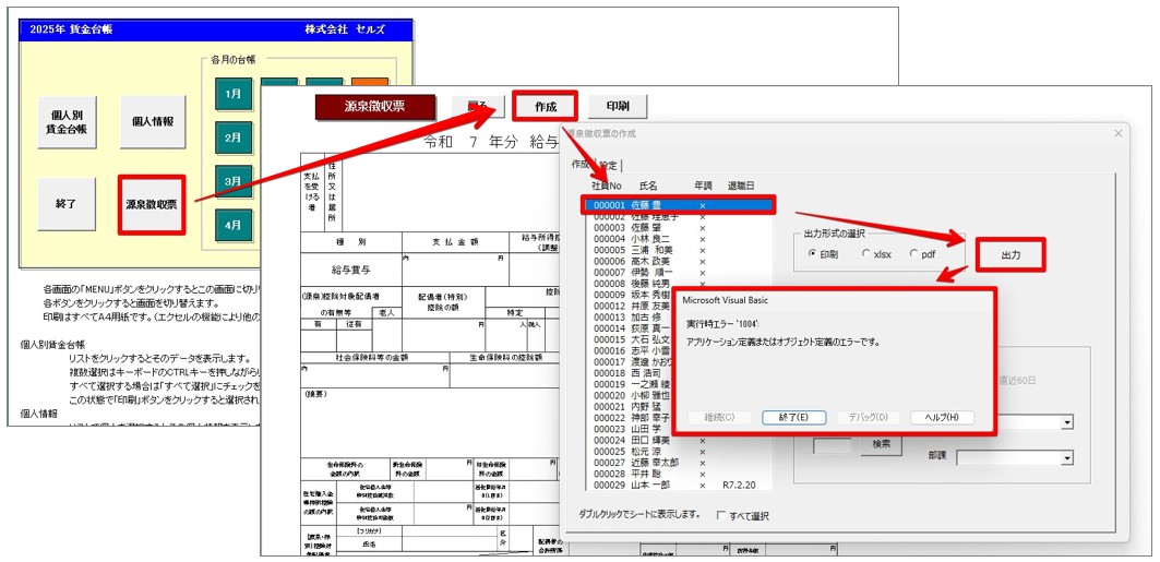 顧客ファイルの源泉徴収票で出力するとエラーが表示される