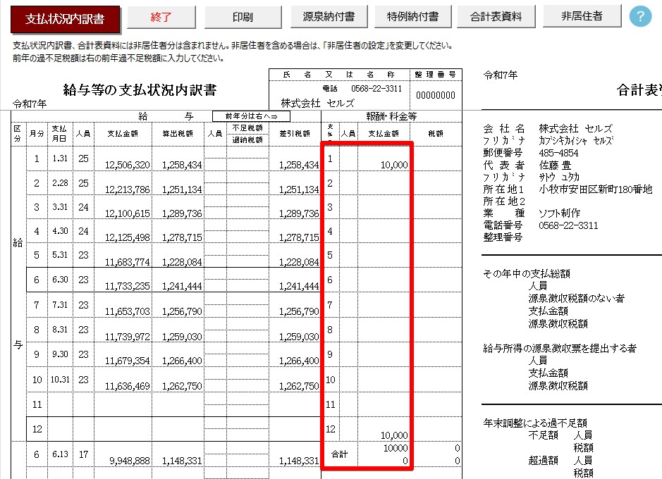 - 支払状況内訳書の報酬・料金等欄で12月の下段に入力しているが、合計欄に集計されない