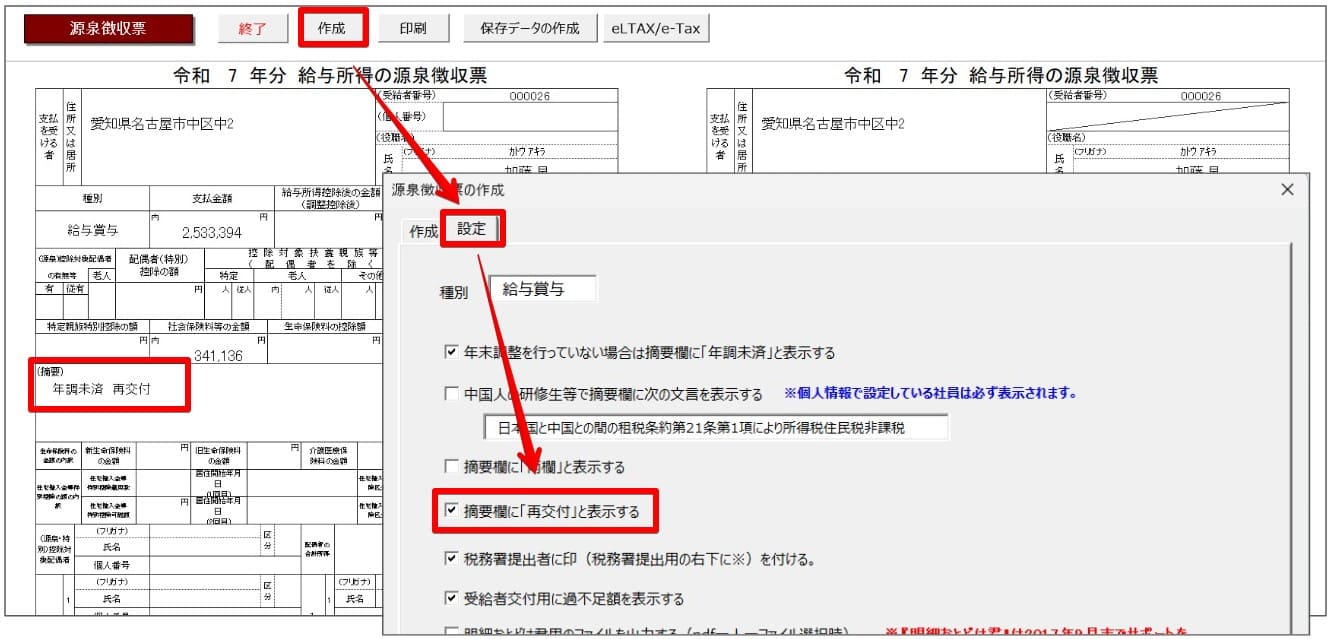 上記に対応するため、源泉徴収票の摘要欄に「再交付」を表示する機能を追加しました。