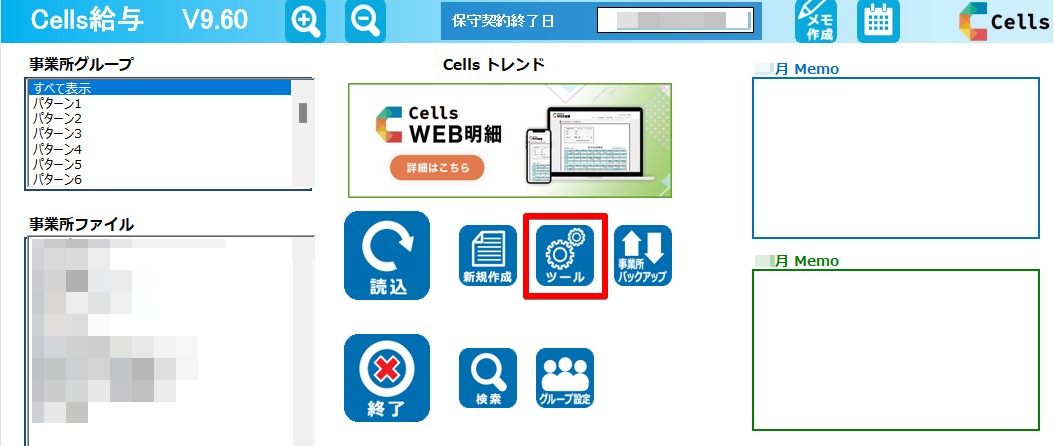 1.Cells給与起動画面から「ツール」をクリック